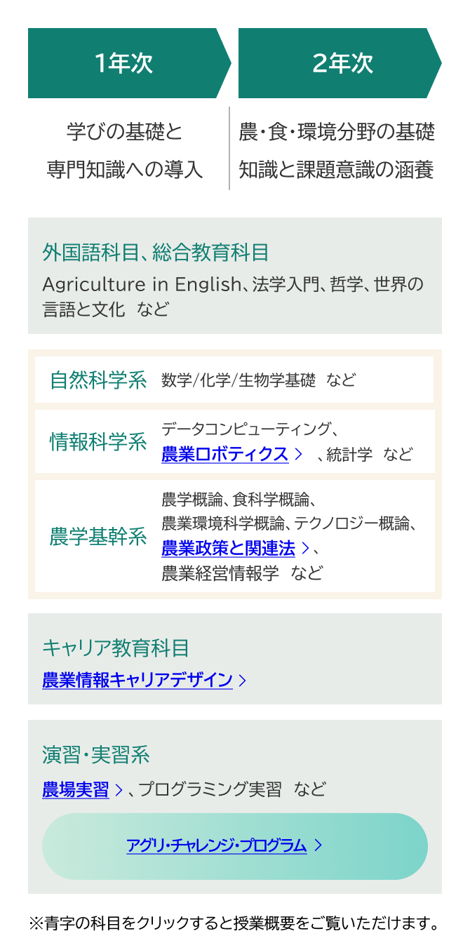 作物や土壌、植物生理学といった「農学の基礎」を土台に、データサイエンスやロボティクスを融合する先進的なカリキュラムを展開します。