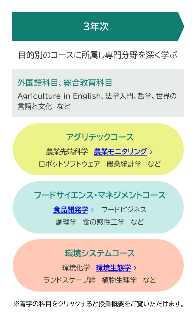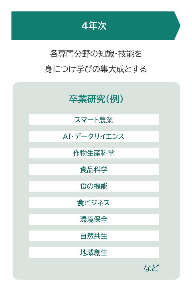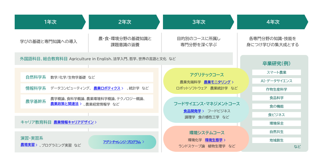本学部では、学生一人ひとりが自分の将来と向き合いながら学びます。1・2年次は、農・食・環境分野や情報科学の基礎、キャリア教育科目や実習科目の学びを通じて、キャリアへの意識を高めていきます。3年次からは、卒業後を見据えて自ら選択したコースで専門性を深め、農業関連業界はもちろん、幅広い分野で通用する力を身につけます。